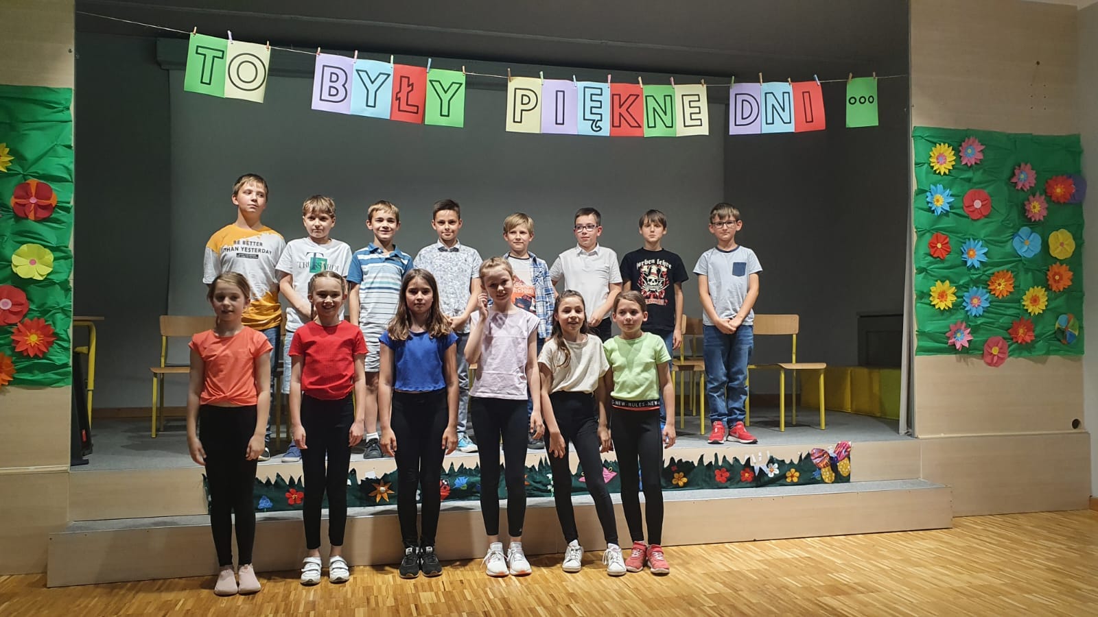 Kolorowe przedstawienie uczniów klas 3a i 3b na koniec pierwszego etapu edukacji